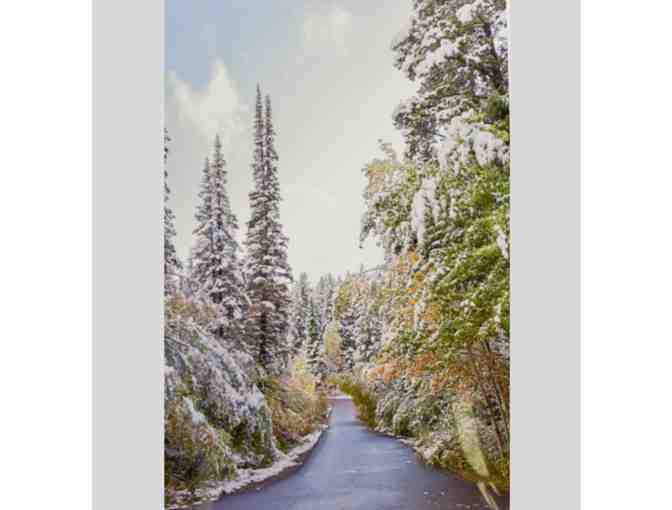 In this enchanting winter scene, a narrow road stretches ahead, flanked on both sides by a pristine blanket of freshly fallen snow. The trees, standing tall and proud, wear delicate coats of white, their branches laden with the weight of glistening snowflakes.