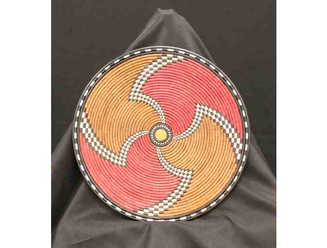 R Bar Wood Art titled: "Hopi - Third Mesa" by Ken Ragsdale. Maple platter with basket illusion design in the style of a Hopi woven basket. About the artist: "His artistry of creating with wood is an inward journey filled with passion, always searching for new ways to express those feelings. They may manifest themselves either in a larger or smaller vase with embellishments, some other new design, or reaching back into his Native American heritage for inspiration . His latest love, however, is that of creating what is referred to as basket illusion. This technique has the look of a woven basket, but is made entirely of wood. Each individual bead is hand painted incorporating a custom created design for each basket Illusion piece. Each one being an original design."