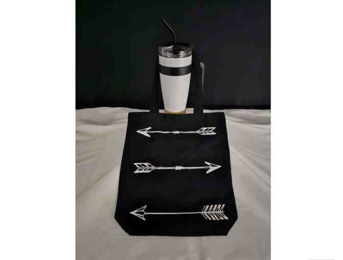 3 Arrows Black Canvas Tote with a double wall Stainless Steel 40 oz black and white Tumbler. Great use as a grocery bag, diaper bag, church bag or lunch bag. For all those on the go needs. 15 inches long 13.5 inches wide