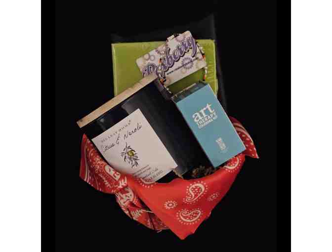 Relax, reset and really care for yourself with this basket. Includes: Candle, Scarf, Notebook, Mini art kit, leather wallet, bead and pearl bracelet, and $25 Roxberry Gift Card
