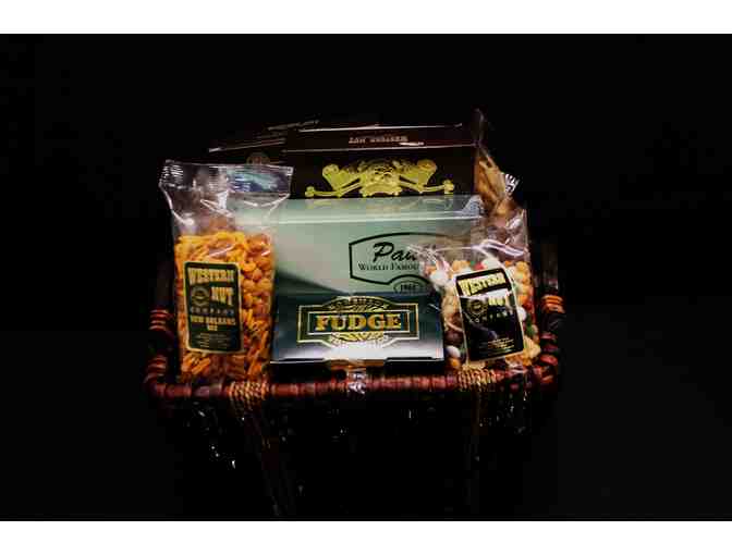 Western Nut Company favorites; Whole Cashews, All nut bridge mix, Two bags of New Orleans Mix, Two boxes of Mixed Nuts, Can of roasted and salted delux nuts, Chocolate covered nuts, Nut fudge, Hero mix bag, Famous Peanut Brittle