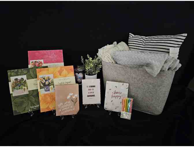 1-Felt Basket, 1- The Gathering Home 50x60 gather throw, 1-Grey Chevron throw, 1-potted faux plant, 1-Art Hearts 100-piece jigsaw puzzle, 3-Life sized pop-up flower bouquets (Dear Dahlia, English Daffodils, Cactus Garden), 1- Latter-day Home black and white striped pillow, 1-"Choose Happy"lined journal, 1-"You were created…" lined journal, 1- 5 gel ink pen set, 1- 4 pack card quotes.