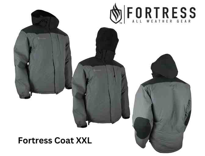 Fortress Coat size XXL: Freezer Fridge Fort Jacket; Charcoal Gray/Black Materials: 100% Polyester Liner 100% Polyester Water Proof | Wind Proof Durable Shell Features: Patented AERIS 500 Insulation Technology in the body. ( / 13MM of loft) & (1/4 6MM of loft) Insulation in the arms.