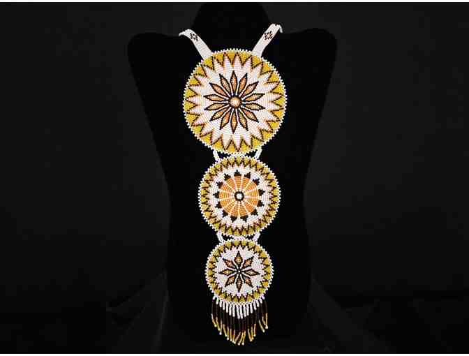 Handmade beaded triple medallion necklace; a beautiful yellow, orange, brown with a background of white. The largest medallion measures 4" round, has a loom beaded chain and is backed with buckskin. Total length of necklace is 24''. Materials: seed beads, leather Chain style: Bead