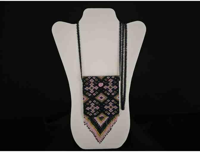 Navajo artist, unkown. Such pouches are not only functional but also serve as a form of wearable art, expressing the creativity and cultural identity of the artisan. They may be used as a traditional accessory in ceremonies, celebrations, or daily life, becoming a meaningful and cherished item for the woman who owns it. The fully beaded woven pouch represents a blend of craftsmanship, cultural heritage, and individual expression, making it a unique and beautiful accessory.