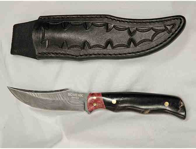 A classic, small sized knife that's ready for the ranch! This trailing point hunter features a classic blade design and handle (black and red). The high-carbon damascus which is made up of 1080 and 15N20 is forged here in the Schenk factory in Idaho. No two pieces of damascus are ever the same, making each knife a unique treasure.