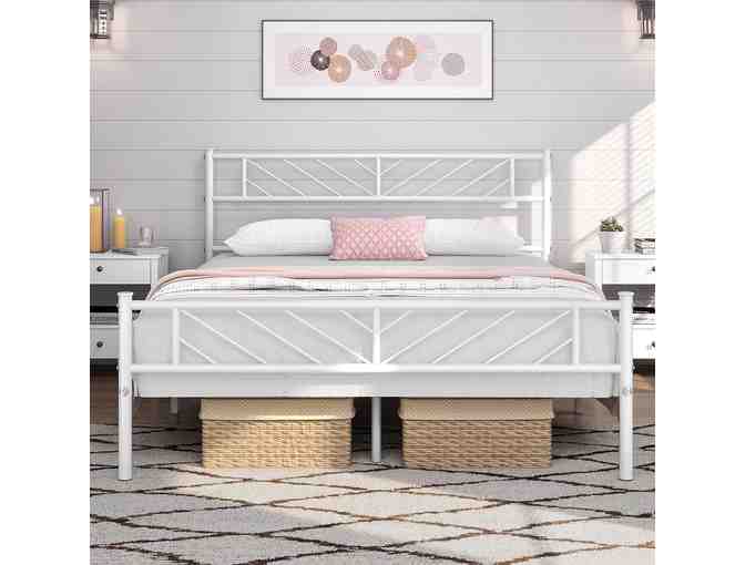 White Yaheetech Queen Size Platform Bed Frame with Arrow Design Headboard, 13 Inches Metal Mattress Foundation for Storage, No Box Spring Needed. The stylish head and footboard of this metal-framed queen bed are embellished with chic arrow patterns. New in the box.