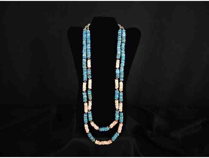 Handmade necklace using Turquoise and pink shell; two strands 24'' and 26''. Bound to be a family heirloom that is passed down.