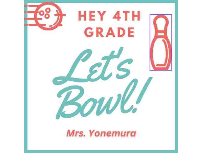Mrs. Yonemura and Mrs. Romero are inviting students bowling this year. It will include an hour of bowling at Corbin Bowl and snacks, on Friday, April 19th which is a minimum day. Mrs. Yonemura and Mrs. Romero will drive the students to the bowling alley and their parents can pick them up from there at 2pm. Winning bidder can bring a Hesby friend!