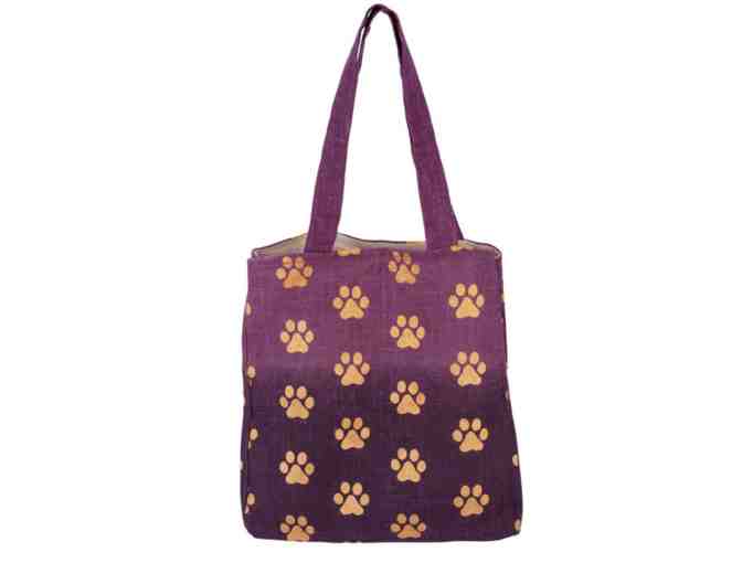From a bright to royal purple background, these golden paw prints travel across this ombre bag. Made of strong jute material, this button-up tote bag can hold all of your necessary belongings!