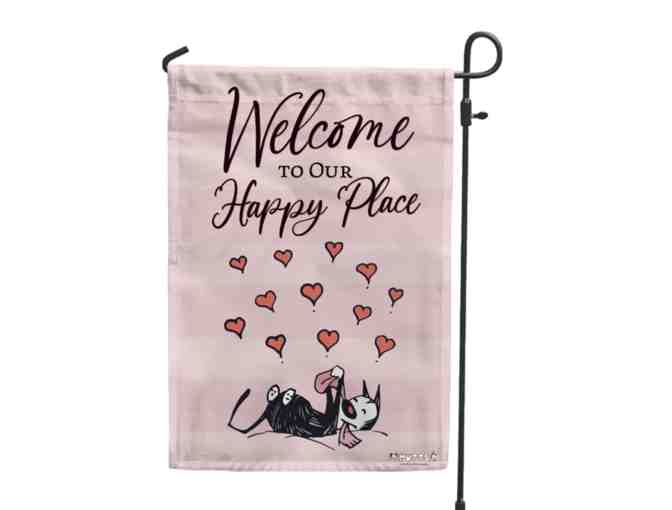 This cheerful, 12" x 18" garden flag for animal lovers features Mooch playing with his beloved Little Pink Sock along with the phrase, "Welcome to Our Happy Place" in decorative black font. Display this flag in your garden, on your front lawn, in your backyard, near your front door, or anywhere else you please.