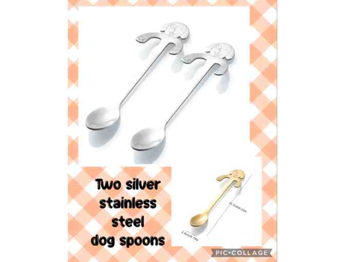 Two stainless steel (silver tone) dog spoons to hang on your coffee cup.