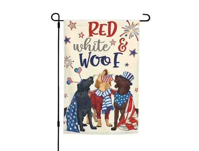 Double-sided polyester garden flag. 18" x 12". No flag stand included.
