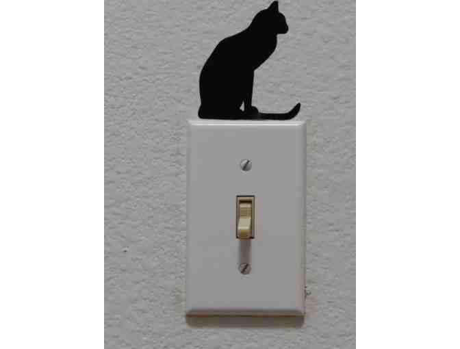 So if you have cats or just like them but don’t have any because of allergies then maybe our Cat silhouettes would be right for you. They are cut from a self-adhesive reposition-able black vinyl. They are all sized to fit on top of a standard wall plate either switch or receptacle. Makes a great gift for anyone who loves cats.