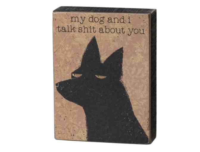 A rustic-inspired wooden block sign featuring a "My Dog And I Talk Shit About You" sentiment with smug dog design. Contains predrilled back keyhole for easy hanging or can free-stand alone. Complements well with coordinating pieces in collection for a sassy pet display.