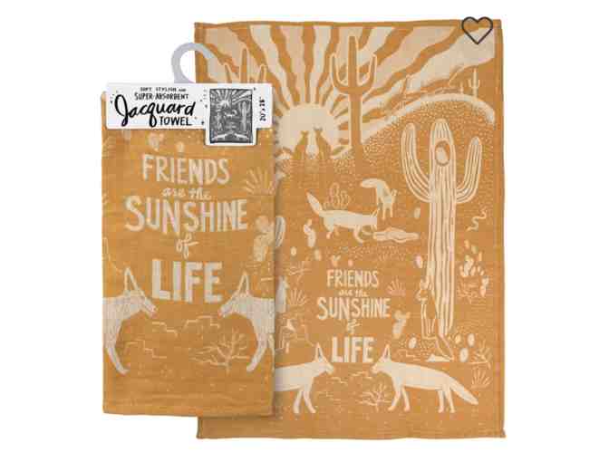 A jacquard woven kitchen towel featuring "Friends Are The Sunshine Of Life" sentiment and desert-themed design. Machine-washable.