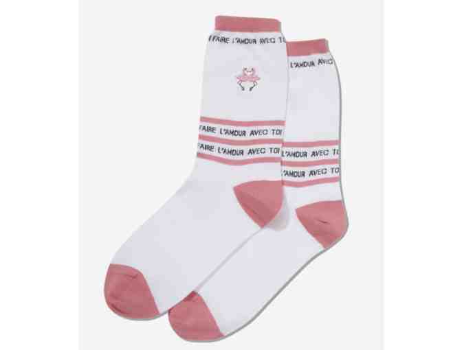 Made to flamingle. These charming crew socks showcase flamingo embroidery, colorful trim and romantic lettering. Show them off on a date, or gift them to your Valentine.