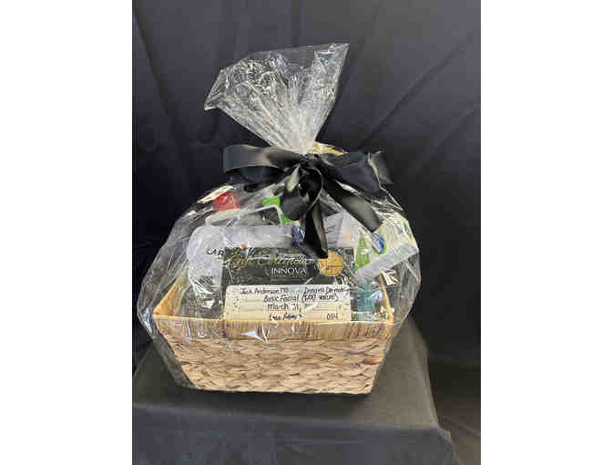 Basket contains a certificate for a Basic Facial (value $100) for Innoca Dermatology, as well as various Cetaphil and Eucerin lotions and moisturizers.