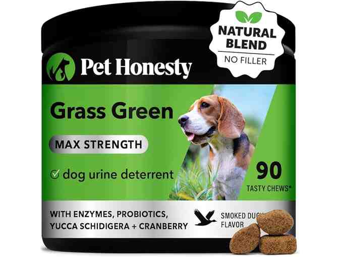 Pet Honesty Grass Green soft chews help reduce yellow grass spots and grass burn caused by dog urine. These delicious soft chews work by helping to reduce nitrogen levels in your dogs urine - the culprit behind grass burn spots - and strengthen your dogs digestive system and intestinal health. Natural ingredients - like enzymes and probiotics - also help to keep bowel movements regular and support a healthy digestive tract. -No corn, wheat, soy, or artificial preservatives. 9.5 ounce container with 90 smoked duck flavored chews. Expiration date 12/13/2024.