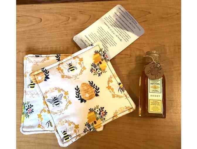 Pretty set of handcrafted 7.5 x 7.5 inch bee themed pot holders made with insul-bright heat resistant batting. Includes an 8 ounce jar of peach infused honey from Whetstone Bee Garden of Marion, Ohio.