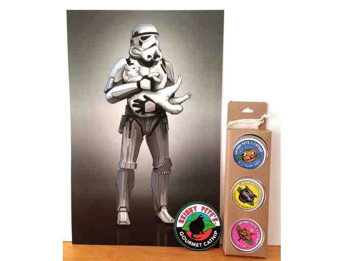 A long time ago, in a litter box far, far, away.... This 11x17 inch poster is just the right size for the Star Wars enthusiast in your life! Original art by Artist, Rich Jackson. From the Skinny Petes Catnip collection. Three piece gourmet gift set for cat lovers! Each set comes complete with three tins of organic catnip. There is Blue Meowy Wowy with a hint of spearmint, unflavored, Furmaceutical Grade and Purruvian Pink with just a hint of peppermint. Includes a free, small cloth bag to use as a cat toy. Each tin contains about .2 ounces of dried catnip, all home grown in the USA.