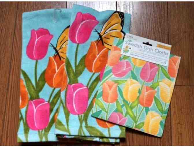 Brighten your kitchen with this pretty spring set that includes two soft velour dish towels with terry back and two coordinating Swedish dish cloths. Swedish dish cloths soften when wet and wash and dry like a dream. Use them instead of paper towels to blot up spills -- they absorb 20x times their weight in water and dry out quicker than sponges. One Swedish dishcloth replaces 17 rolls of paper towels.