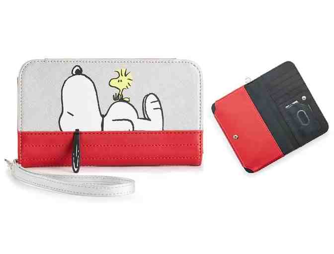 Stay organized with this Snoopy and Woodstock vinyl, bi-fold tech wallet. 4 inches H x 6.75 inches W x 1 inch D; 6.5 inch removable wrist strap; Snap closure; Silver-tone hardware; Interior: 2 bill slots, 5 card slots; tech pocket measures 6 inch L x 3 inch W; Exterior: 1 zipper pocket, 3-D applique ear slide pocket.
