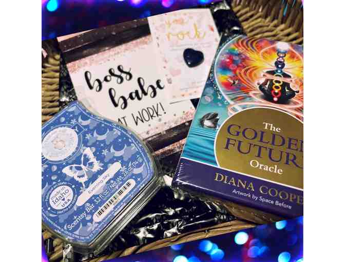 Another creative bundle with an oracle deck. This one has a blue blessing stone and Evening Sky melting wax. You also get a door hang that tells the family you are "at work." All in a pretty black lacy bag. $22. ONE available. PS. Could be a great graduation gift for the right graduate!