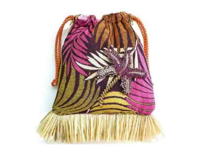 Palm tree brooch detail; Raffia fringe; Metallic gold fabric on backside; Palm design fabric; Made in Italy.