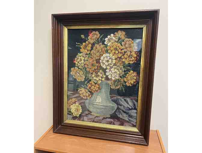 Cool vintage floral needlepoint framed in wood and gold frame. Neat statement piece for your home or office that is ready to hang. Measures approximately 22 inches in height and 17 1/2 inches wide. Donated by Fred Rabel and Valdir Moura Medeiros