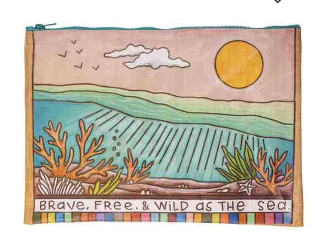 Made of post-consumer material, this double-sided zipper folder features colorful wood burned designs with "Brave, Free, & Wild As The Sea." sentiment. Contains a top zip closure.