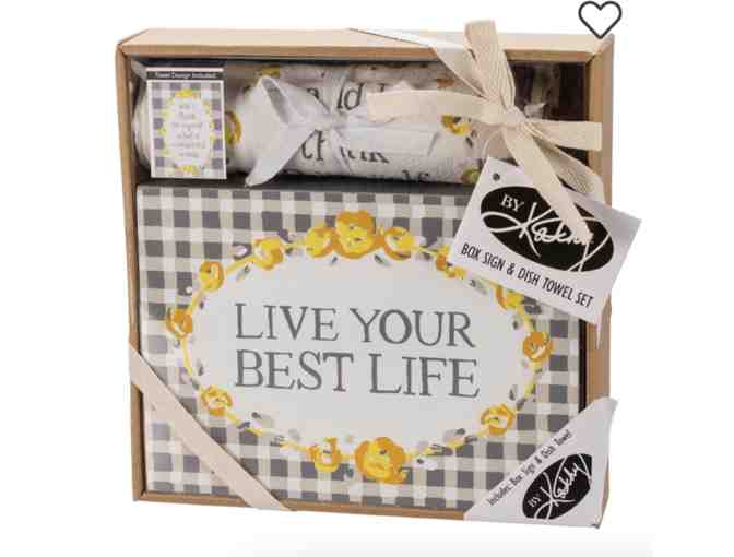 Dimensions: Box Sign: 7" x 5" x 1.75", Dish Towel: 18" x 28"