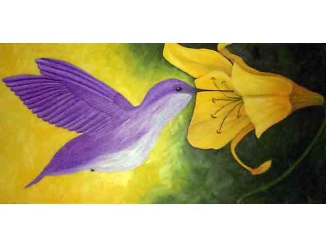 Large oil on canvas featuring a beautiful purple hummingbird enjoying a yellow flower's nectar entitled "Sweet Smell of Success", was painted by Contemporary Realist and Abstract Artist, Regina Petrecca. From the artist: I usually paint in a contemporary realist style and my love of color shines through in many of my paintings. I always want the viewer to be aware of the hand of the artist. I don’t want my painting to look like a photograph…that’s why we have cameras! The painting measures 48 inches (4 feet) long by 24 inches (2 feet) height and will make a bright, happy statement on any wall. The painting is ready to hang.