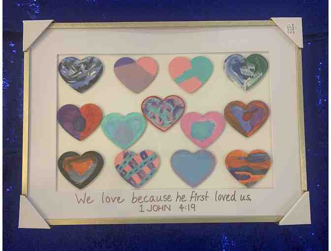 The students of 3A each painted gorgeous wooden hearts that have been matted and framed with the inscription, "We love because He first loved us. 1 JOHN 4:19"