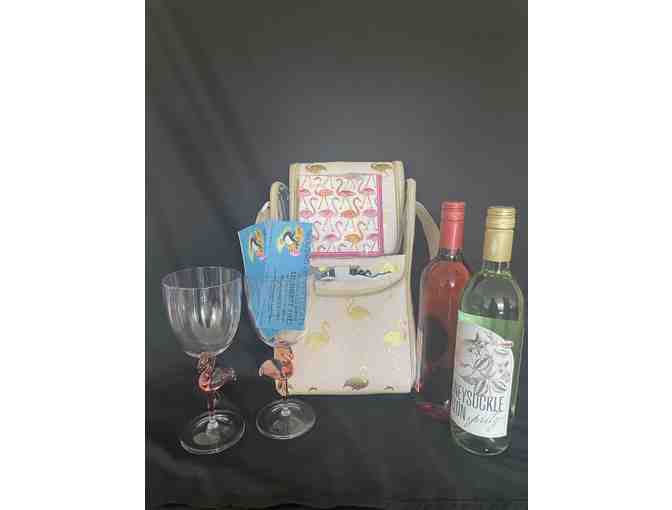 Enjoy a relaxing evening on the beach watching the sunset with this wine cooler, flamingo wine glasses, a bottle of melon moscato and rosé. End the evening with some ice cream from Snow Bird OBX.