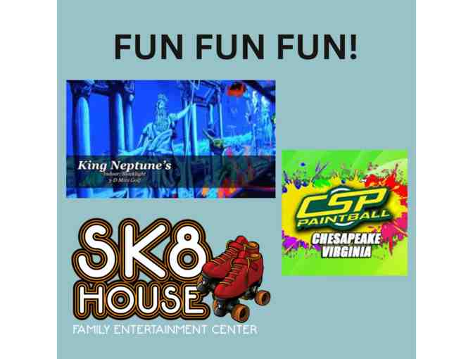 King Neptune's is Hampton Roads premier indoor, blacklight, "3-D" mini golf. It is a great place for family fun, birthday parties and youth groups. This artistically created 10 hole miniature golf course features the ultimate in the blacklight 3-D experience.