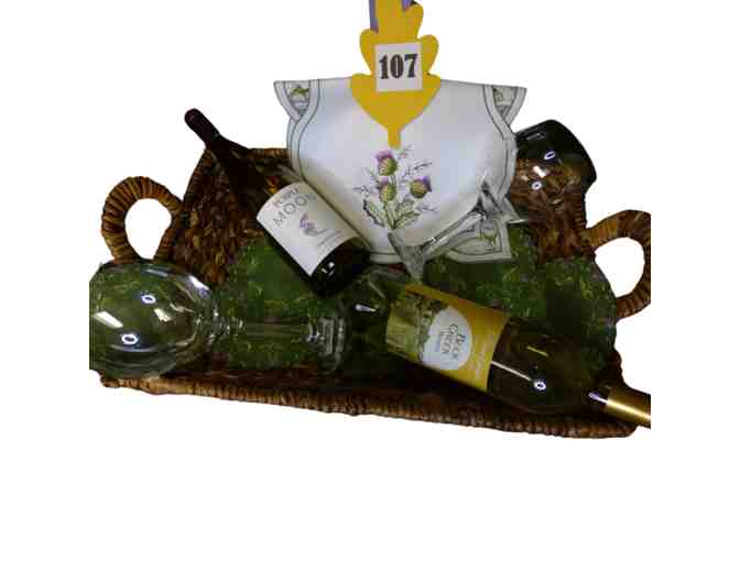 The focal point of this basket is this lovely embroidered centerpiece matt (18"x11") with thistles and handcut edges. Then there are 6 matching thistle coasters plus two bottles of white wine (a chardonay & a pino grigio) and wine glasses, of course.