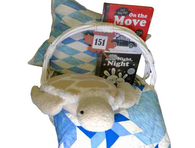 This beautiful handmade quilt is destined to become a heirloom! At 54"x60", it's great for baby but also big enough for a toddler bed. It has a cuddly matching pillow. We also included a stuffed sea turtle that compliments the waves and swirls of the quilt fabrics and a set of three baby books.