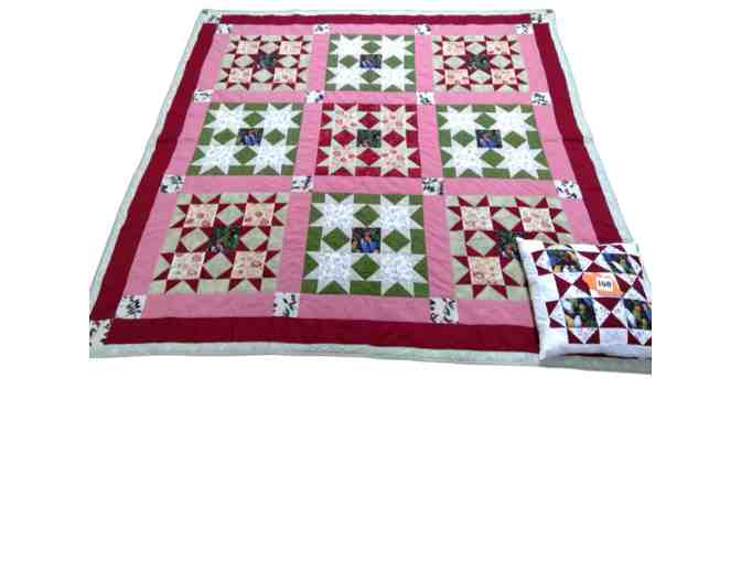 We're quite pleased to be able to offer this exquisitely crafted, beautiful handmade 9-block quilt that will fit a Queen/Double size bed. It is 88 inches by 88 inches and includes a coordinating quilted pillow.