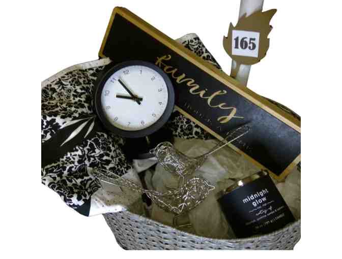 This stylish basket has an amazing handmade quilt that is 64"x70", the perfect size for a throw, over the back of the couch or hung on the wall. Then you'll have a "Family Makes this House a Home" plaque, a midnight glow candle and a stylish standing clock.