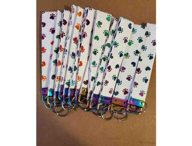 Very adorable key chain 6" long and 1" wide. Nicely made. Assorted paw prints on white background. New. Shipping included.