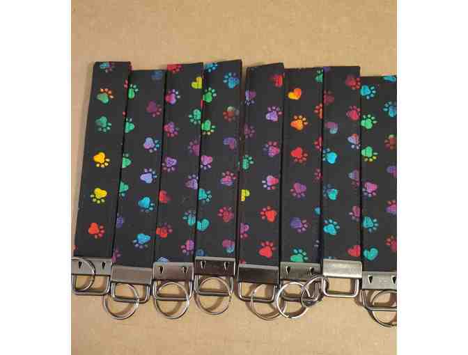 Very adorable key chain 6" long and 1" wide. Nicely made, great gift or for yourself. Assorted paw prints on black background. New. Shipping included.