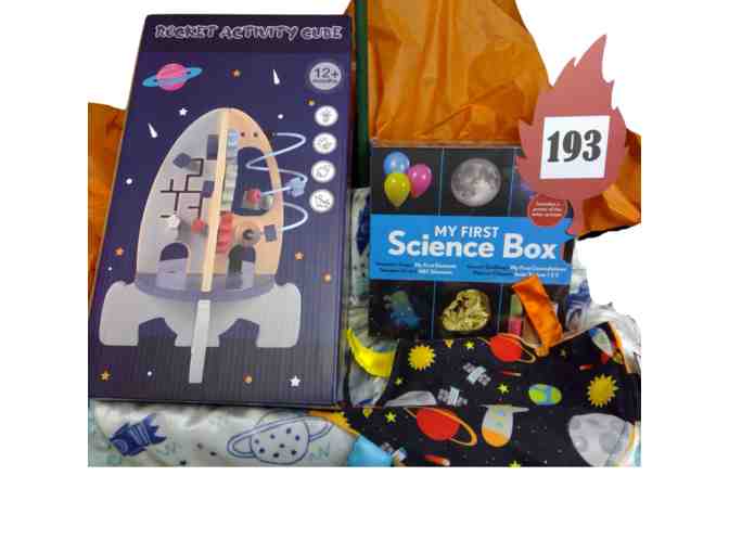 If you baby is planning on being a scientist (or at least Mom & Dad are planning) this is a great basket for you. We start with a Rocket Activity cube, and add a boxed My First Science box, a sensory tag toy and the softest rocket ship blanket.