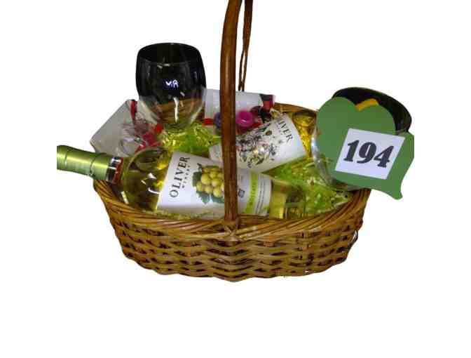 Oliver Wine fans get in line! This basket is for you. We have a nice Moscato and a Camelot Mead plus two wine glasses and two wine stoppers.
