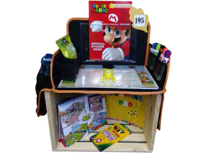 This black travel tray is designed to sit on a childs lap and then fold up to store attached to the seat in front of them. We added several crafty items to fill the travel time - from markers, dry erase games and a Mario sticker book, to a drawing pad, colored pencils and a 4-in-1 travel game. The wooden crate is an added bonus.