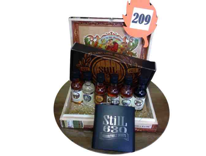 Inside we have six sample bottles: Rally Point (Straight Rye Whiskey), Volstead's Folly (American Gin), Knowledge of Good (Apple Brandy), S.S. Sorghum (Straight Whiskey), Expedition Rum and Big Jake (Whiskey with natural flavors). On the front we poised a flask with their logo.