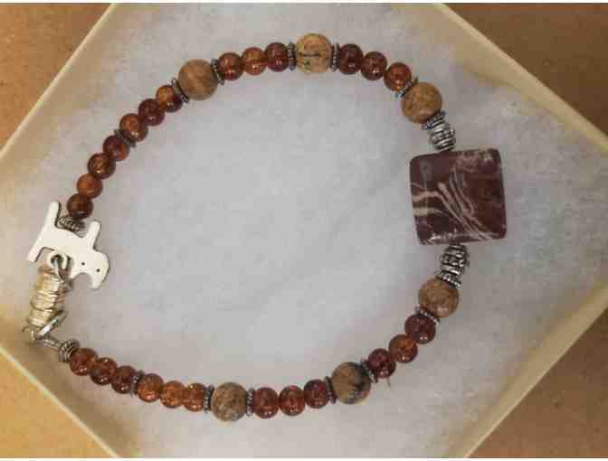 Bracelet, aprox 8" long with topaz and wooden beads. With magnetic clasp and kitty charm. Shipping included.