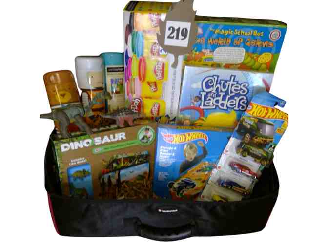 You have to look deep into this basket to see ALL there is to see. We have 2 - 9 container Play-Doh sets (the 2nd is deep inside), a Magic School Bus Germ Kit, 3 tins of puzzles, a Chutes & Ladder game, and lastly but really most importantly two zip bins in which to store your dinosaurs and Hot Wheels plus dinosaurs and Hot Wheel cars to put in them. By the way the black holder is a Golf bag for your car.