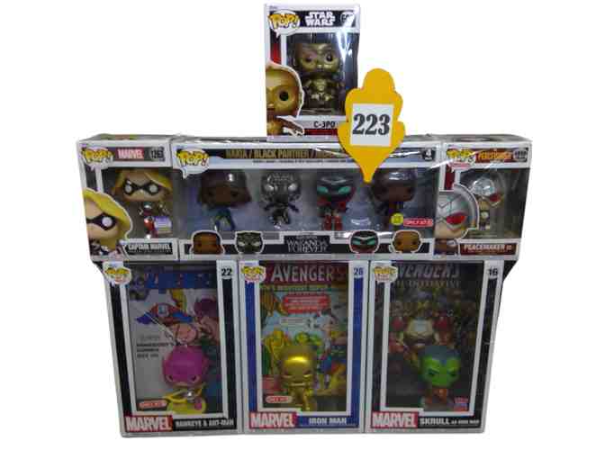 We have 3 Marvel collectibles - Hawkeye & Ant-man, Iron Man and Skrull as Iron Man. In addition, we have the POP! collectibles - Captain Marvel, 4 Black Panther Wakanda Forever, Peacemaker and Star Wars c-3PO.