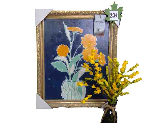 This hangable art piece is 20" by 24" and is beautifully framed. We added a vase of companion flowers. This would look so nice in any hallway.